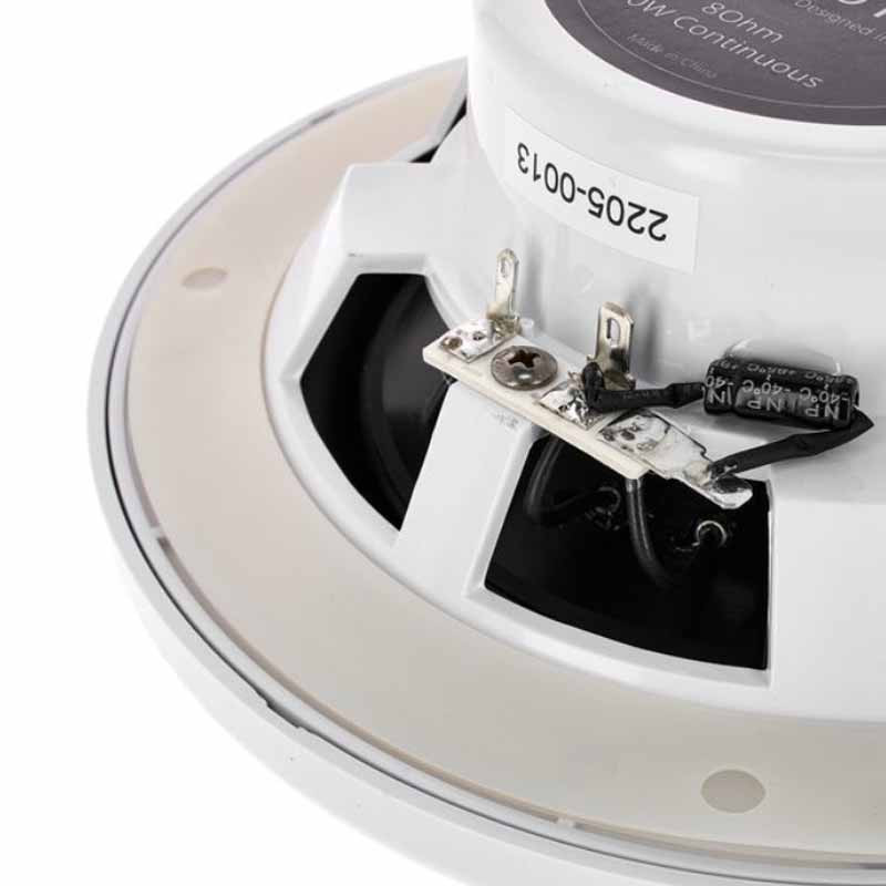 Biamp CMAR6T-W – акустическая система, предназначенная для использования в зонах с высокими температурными условиями до 95°С и высокой влажностью (сауны, бани, душевые). Модель оборудована водонепроницаемым уплотнительным кольцом для монтажа на плоских поверхностях. Конструкция корпуса защищает от вертикального проникновения жидкостей, съемный гриль изготовлен из нержавеющей стали, а корпус из высококачественного ABS пластика.