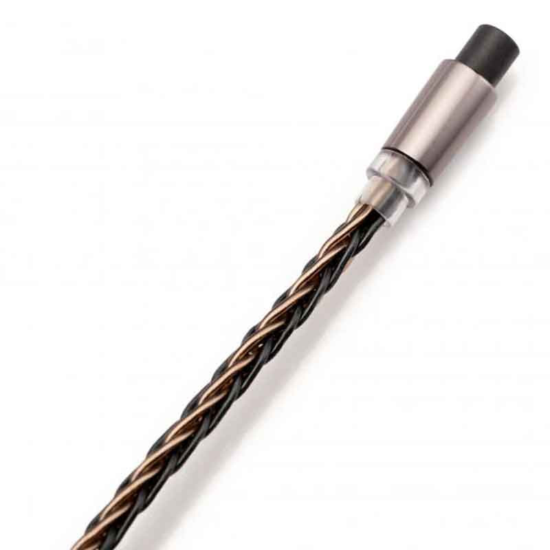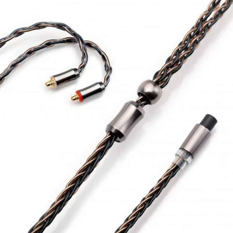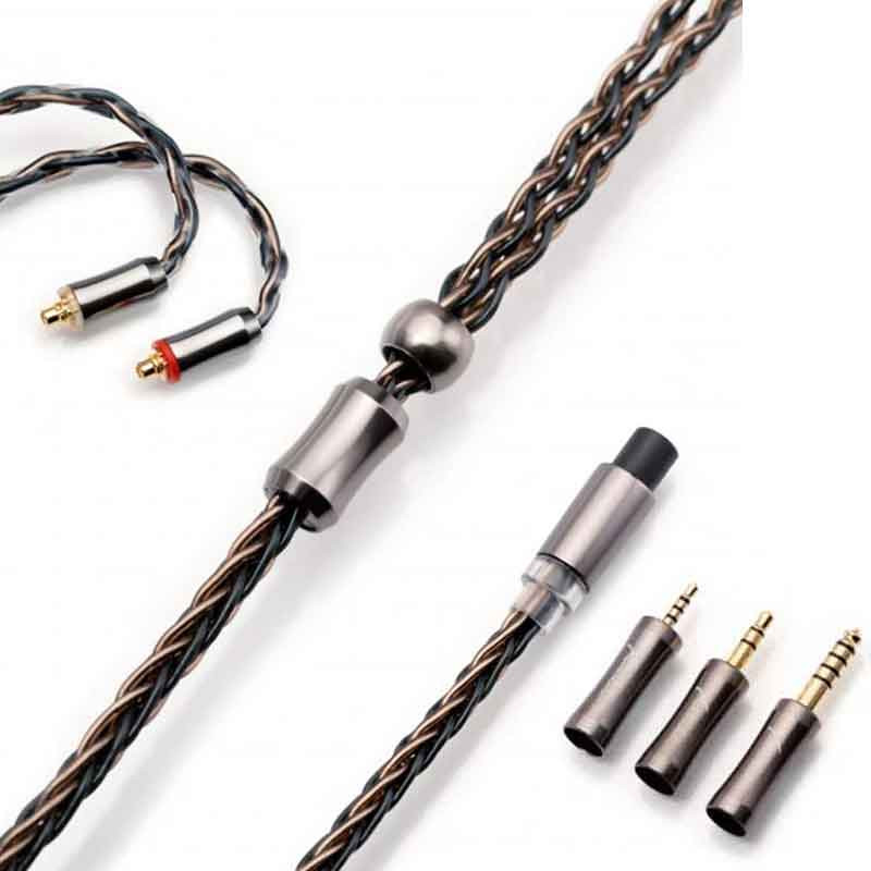 Kinera Leyding MMCX – эффектный плетеный литцендрат, проводники которого изготовлены из меди высокой степени очистки. Примечательно, что эффектности внешнего вида продукта способствует изоляция двух оттенков – золотистого и черного. Стоит также отметить, что кабель отличается и изрядной мягкостью, пользоваться им очень удобно. К тому же, качественная силиконовая "доспехи" хорошо противодействуют микрофонному эффекту, что тоже важно. Что касается подобранной фурнитуры, то здесь ситуация следующая: ползунок, делитель и корпуса ММСХ-коннекторов выполнены из металла, сформированы заушины – мягкий силикон. Отдельного внимания заслуживают съемные аудиоджеки (в комплекте 2.5, 4.4 и 3.5 мм): благодаря специальному 5-пенному креплению они надежно фиксируются, но при этом достаточно легко снимаются и устанавливаются.