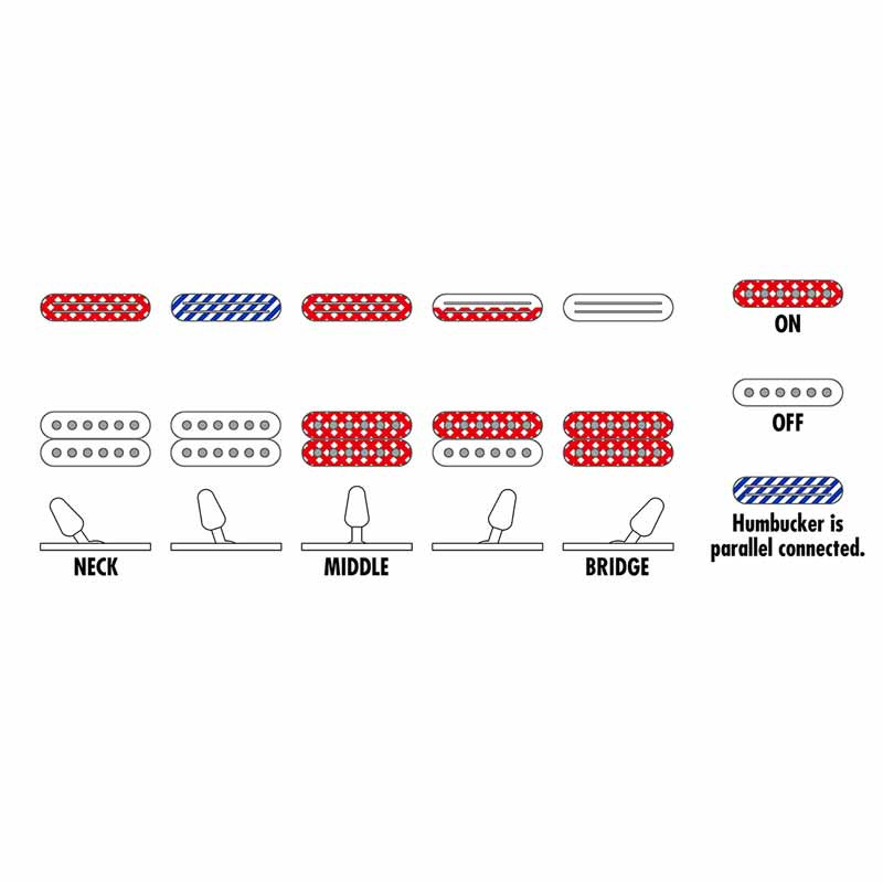 Для переключения между звукоснимателей на гитаре установлен переключатель делающий активным один или два из установленных на гитаре звукоснимателей. Переключаясь между звукоснимателями, можно изменять производимый гитарой звук. Возможны разные комбинации в конфигурации звукоснимателей, например s-s-s (сингл-сингл-сингл) или s-s-h (2 сингла и хамбакер), с помощью регулятора Вы можете переключаться между звукоснимателями, использовать в удобной конфигурации.