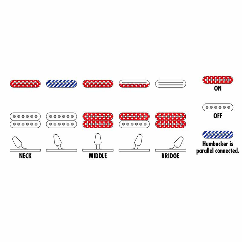 Для переключения между звукоснимателей на гитаре установлен переключатель делающий активным один или два из установленных на гитаре звукоснимателей. Переключаясь между звукоснимателями, можно изменять производимый гитарой звук. Возможны разные комбинации в конфигурации звукоснимателей, например s-s-s (сингл-сингл-сингл) или s-s-h (2 сингла и хамбакер), с помощью регулятора Вы можете переключаться между звукоснимателями, использовать в удобной конфигурации.