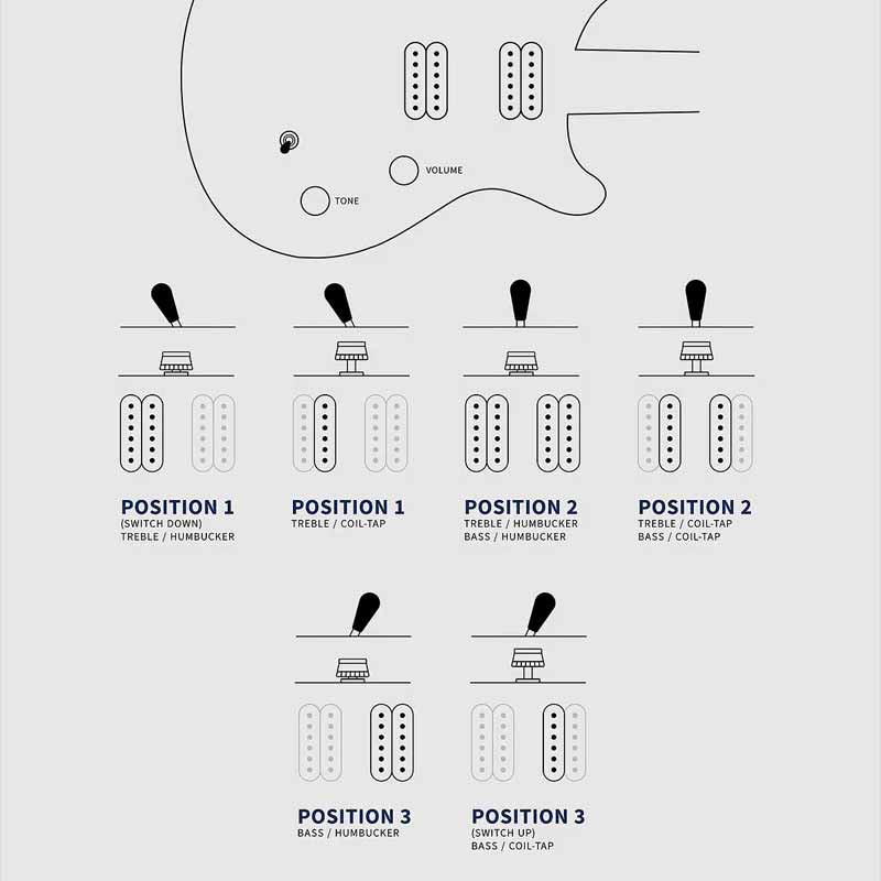 Для переключения между звукоснимателей на гитаре установлен переключатель делающий активным один или два из установленных на гитаре звукоснимателей. Переключаясь между звукоснимателями, можно изменять производимый гитарой звук. Возможны разные комбинации в конфигурации звукоснимателей, например s-s-s (сингл-сингл-сингл) или s-s-h (2 сингла и хамбакер), с помощью регулятора Вы можете переключаться между звукоснимателями, использовать в удобной конфигурации.