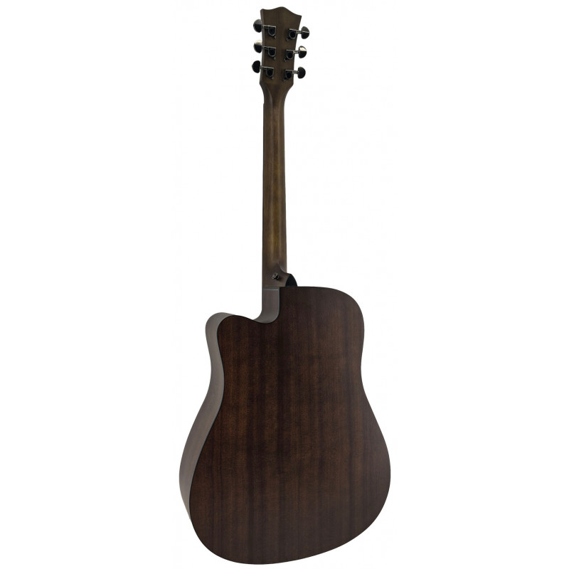 Корпус гитары выполнен по классической схеме: верхняя дека из массива ели обеспечивает яркую атаку и четкую артикуляцию каждой ноты. Задняя дека и боковины из ламината красного дерева добавляют теплоты в средних частотах и создают сбалансированное звучание. Накладка грифа из палисандра не только придает инструменту благородный вид, но и обеспечивает плавное скольжение пальцев по ладам. Матовое покрытие защищает древесину от повреждений и подчеркивает естественную текстуру дерева.