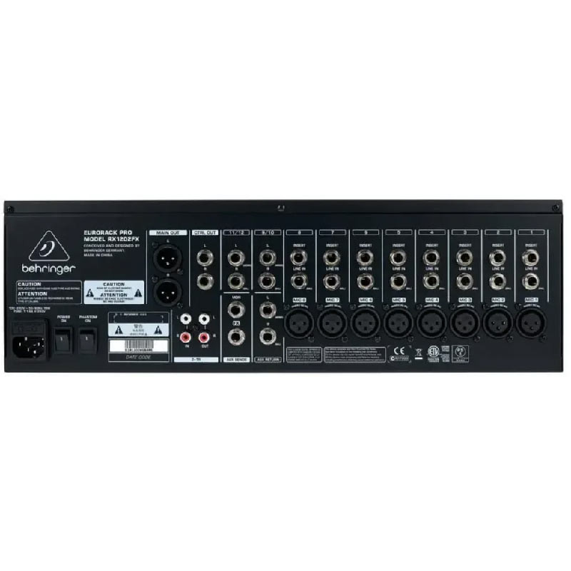 EuroRack PRO rx1202fx дозволяє оперувати вісьмома монофонічними і двома стереофонічними каналами. Вхідна секція розташована на задній панелі корпусу. Крім основних роз’ємів там знаходяться гнізда розривів для моноканалів, до яких можна підключити Компресори, передпідсилювачі та інше допоміжне обладнання, вісім мікрофонних входів, передпідсилювачі для яких вже вбудовані в EuroRack PRO rx1202fx, і вхід 2-Track. Для підключення до мікшера конденсаторних мікрофонів можна подати на входи фантомне живлення 48 V.