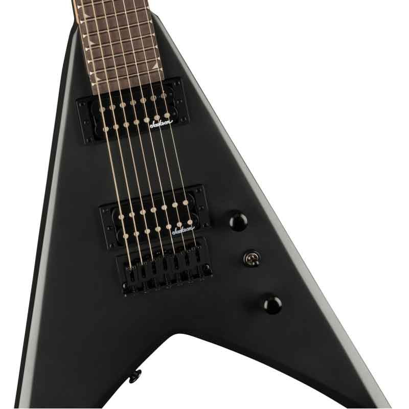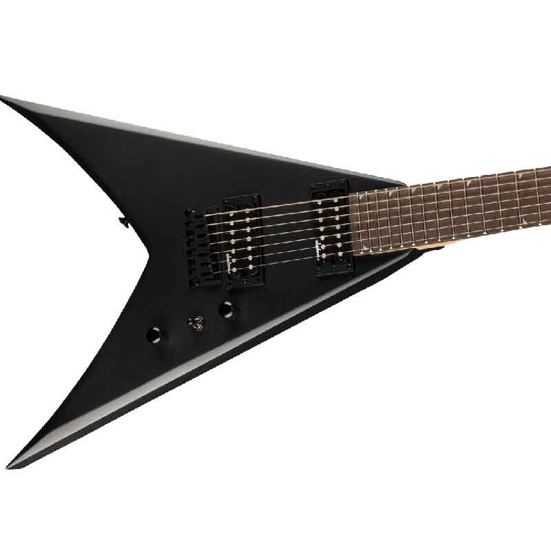 Jackson JS Series King V JS22-7 KV HT (Satin Black) - 7-струнна електрогітара у легендарному «King V» дизайні, розроблена для музикантів, яким потрібна висока швидкість гри та агресивний звук. Корпус виконаний з тополі, забезпечуючи легкість та резонанс, а кленовий гриф з болтовим кріпленням, графітовим посиленням та з'єднанням типу «scarf» гарантує стабільність ладу та довговічність.
