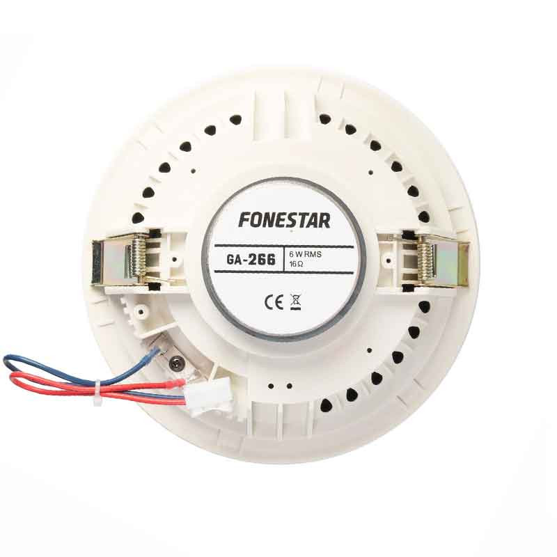 Fonestar GA-266 - стельова односмугова низькоомна акустична система з круглою решіткою. Потужність – 6 Вт, широкосмуговий динамік діаметром 6.5" з подвійним дифузором, що працює в діапазоні частот 140-18,000 Гц. Чутливість – 93 дБ. Акустична система виготовлена з міцного композитного пластику (ABS), решітка алюмінієва.