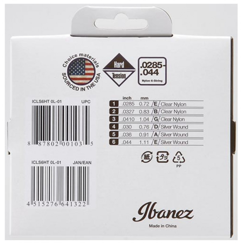 Ibanez ICLS6HT Classic Guitar String 28.5-44 – набір струн для класичної гітари з підвищеним натягом (Hard Tension), створений для музикантів, які прагнуть більшої динаміки, чіткості та виразності звучання. Верхні струни із прозорого нейлону (Clear Nylon) забезпечують чистий та яскравий тон, а басові струни із срібною мідною обмоткою (Silver Plated Wound) надають глибини та потужності.