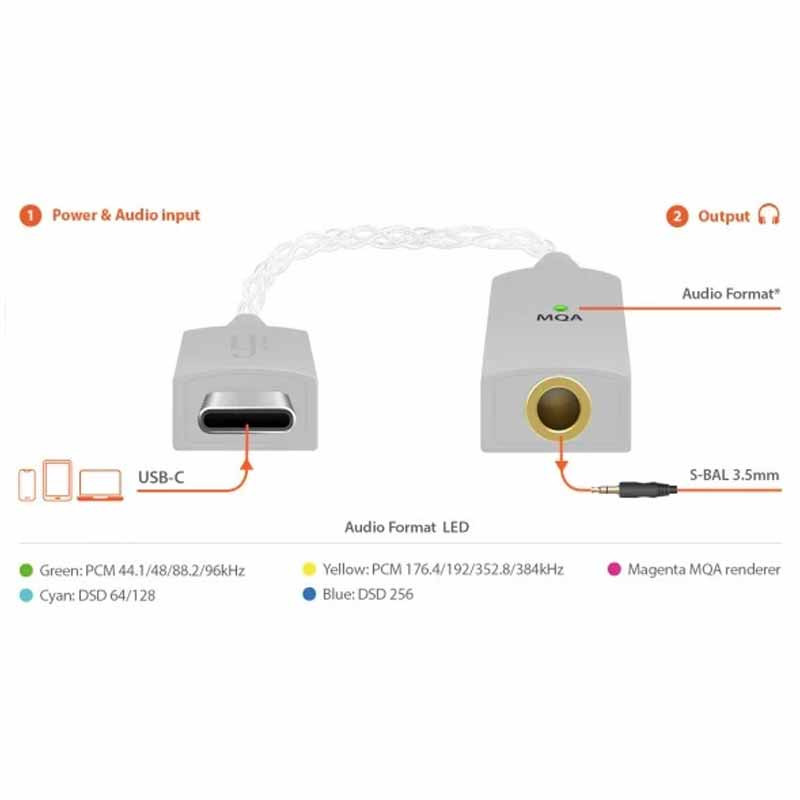 Світлодіод змінює колір, щоб вказати вхідний аудіоформат – PCM, DSD або MQA – та частоту дискретизації PCM/DSD.