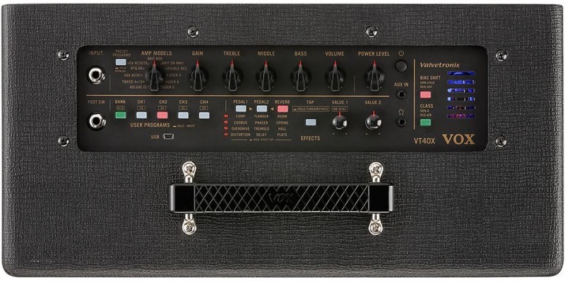 VOX VT40X має щільно закриті бас-світловідбивающі шафи, які забезпечують безкомпромісний тон і резонанс. USB введення і спеціальне програмне забезпечення Tone Room дозволяють повністю налаштувати пресети і ефекти, досягаючи власного, унікального звуку.