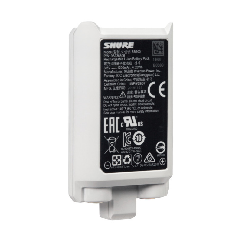 Shure SB903 - це перезаряджається літій-іонний акумулятор, який живить будь-який передавач SLX-D до 8 годин. У разі використання SB903 РК-дисплей передавача показує залишок заряду акумулятора за лічені хвилини та секунди.